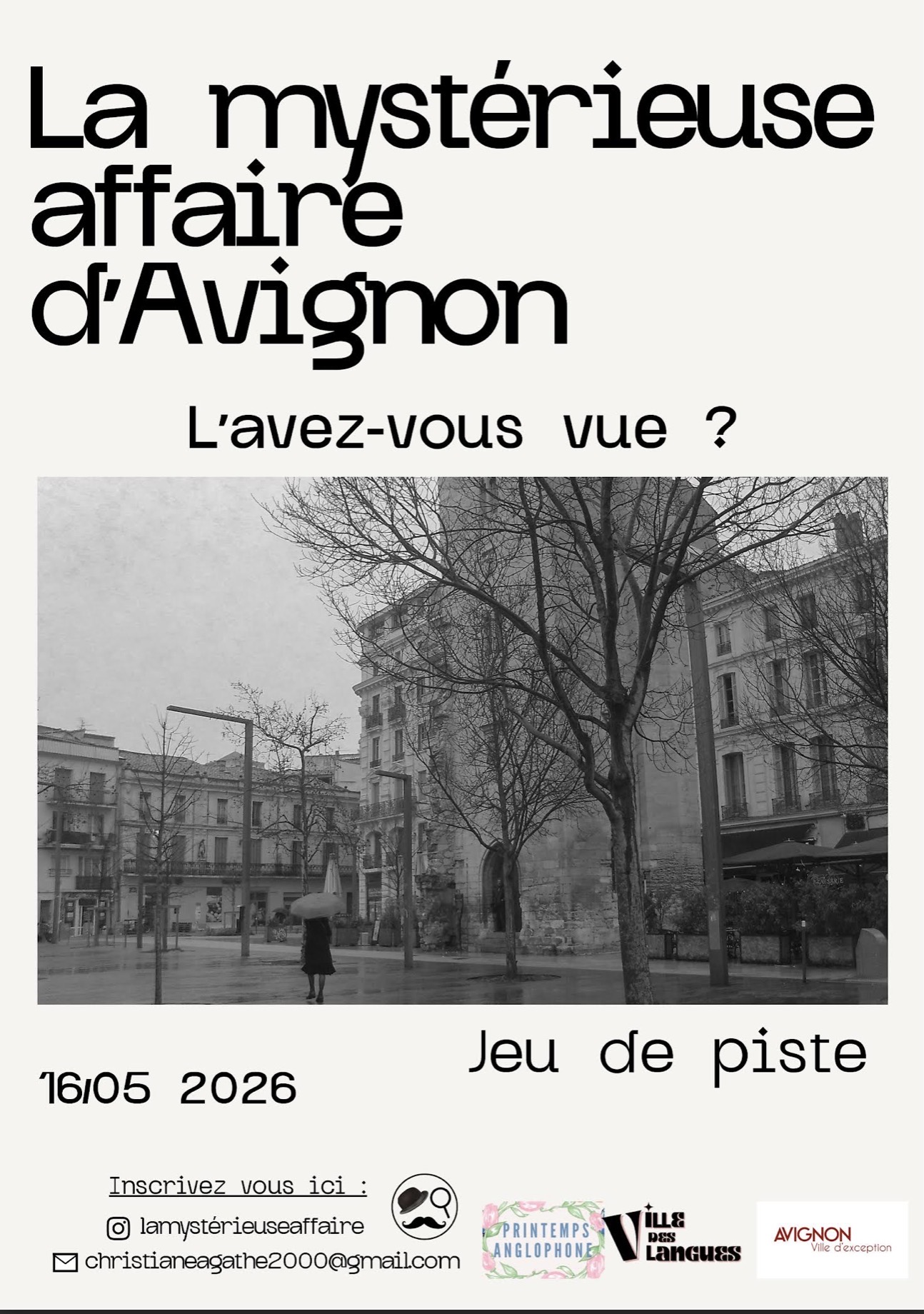 Nous vous invitons à enquêter sur la disparition d’une célèbre autrice de romans policiers dans les rues d’Avignon. Allez de monument en monument à la recherche d’indices pendant environ une heure, et découvrez ce qui est arrivé à la romancière !